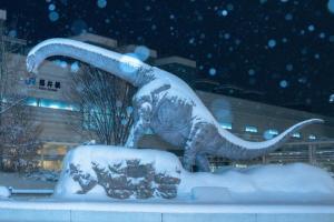 恐竜のモニュメントに積雪↑